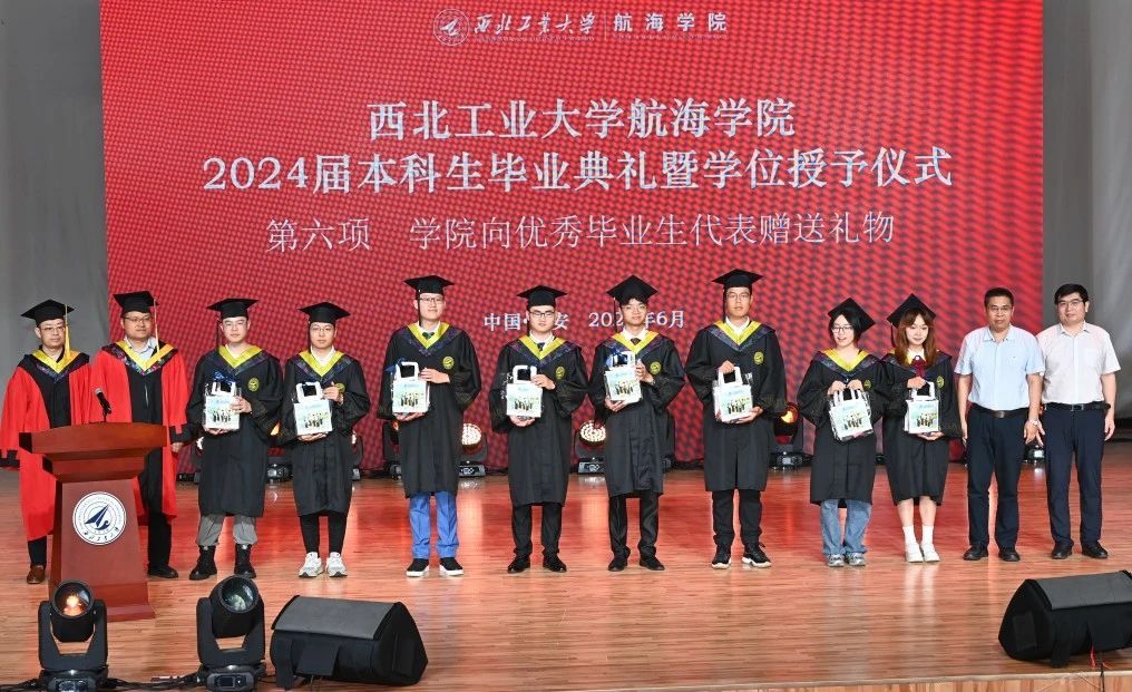 副院长曾向阳、副院长崔荣鑫、党委副书记王银涛、副院长雷波代表学院向优秀毕业生代表赠送礼物,祝同学们前途似锦。