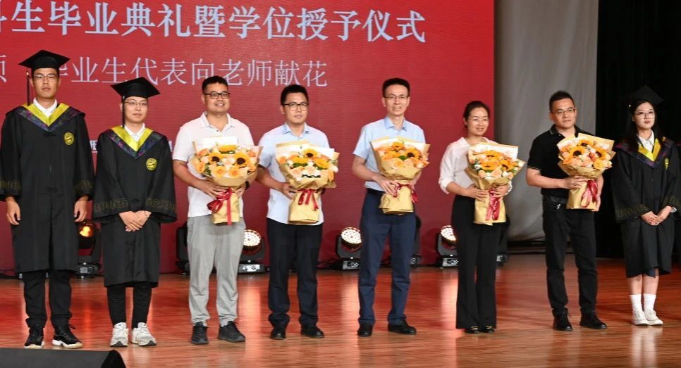 毕业生代表向教师代表献花,感谢老师们的谆谆教诲。