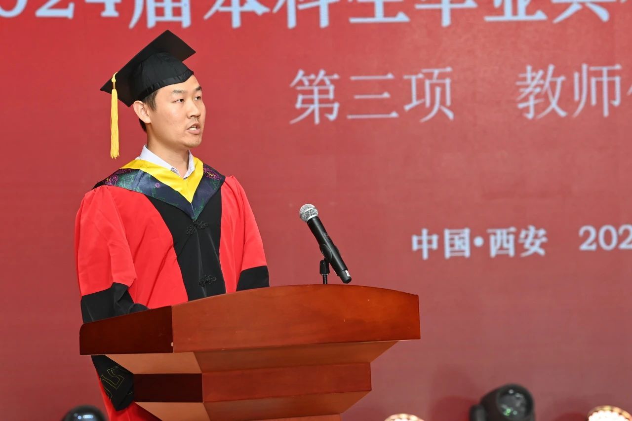 乔月依作优秀毕业生代表发言。她回顾了四年校园学习生活中的点滴印象,并祝愿同学们鹏程万里、一生向阳。