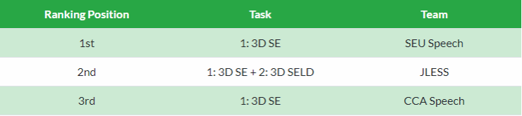 该挑战赛分为两个赛道,3D语音增强赛道和3D声音事件检测及定位赛道。竞赛数据集是“半合成的”,官方通过将真实音频(由2个4通道全向麦克风进行录制)和特定室内环境下的脉冲响应进行卷积,形成带有噪声及混响的3D音频。