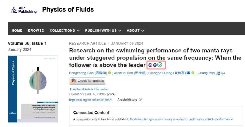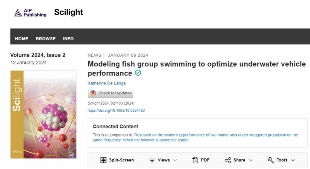 潘光教授团队发表题为“Research on the swimming performance of two manta rays under staggered propulsion on the same frequency: when the follower is above the leader”的研究论文。该研究成果被国际流体力学知名期刊《Physics of Fluids》作为主编推荐特色文章(Featured Articles)发表(图一),并被美国物理学联合会“科学之光”(Scilight)专题文章采访报道(图二)。无码av
