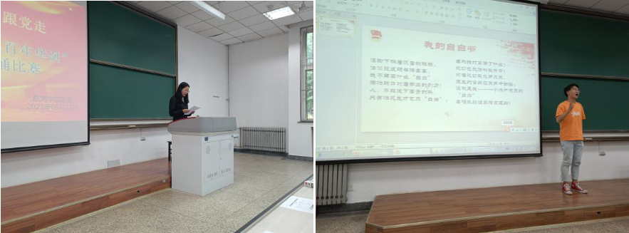 团委组织部石明姝主持,大会伊始,主持人宣布本次比赛正式开始,每位参赛选手依次上台展示。参赛选手们感情饱满,庄严端正,声情并茂,每一位同学或朗诵原创作品,或选择红色经典,配合背景音乐及幻灯片的使用充分展示了海院青年学子良好的精神风貌与综合素养,一篇篇红色经典带领大家重温了一幕幕历史画卷。中国共产党已经走过了100年的风风雨雨,在同学们慷慨激昂的演讲中一幕幕传奇在眼前浮现:望北国千里冰封,看钟山风雨仓皇,到湘江中流击水,听金沙水拍云崖。