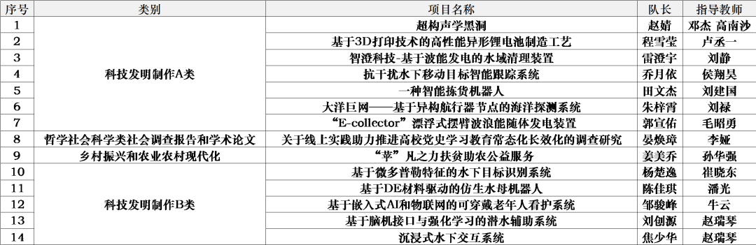 共有14支项目团队入围。其中,科技发明制作A类项目共7个,B类共5个,哲学社会科学类社会调查报告和学术论文1个,创业计划作品竞赛乡村振兴和农业农村现代化组1个。