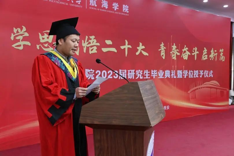 “士不可以不弘毅,任重而道远”“路漫漫其修远兮,吾将上下而求索”。典礼进行第七项,潘光院长致辞。潘光回顾了学院近年来取得的辉煌成就,见证了2023届研究生在校期间经历的大事件,肯定了海院学子的责任与担当。同时潘光寄语毕业生要心怀“国之大者”,立家国天下之志;要坚定矢志奋斗,明永不言弃之理;要担当时代之责,成顶天立地大事。最后,祝毕业生们都能实现更高的成就与价值,常回家看看,祝大家毕业快乐、前程似锦。