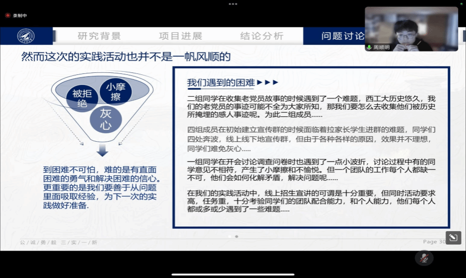 2024 年1月30日,在前期材料整理、目标学生宣传的基础上,实践队进行了线上招生宣讲。实践队同学分别向参与者介绍了西工大优势、西工大老党员故事和高三复习方法等内容。这次活动加强了实践队同学们高中母校学生及家长对无码av