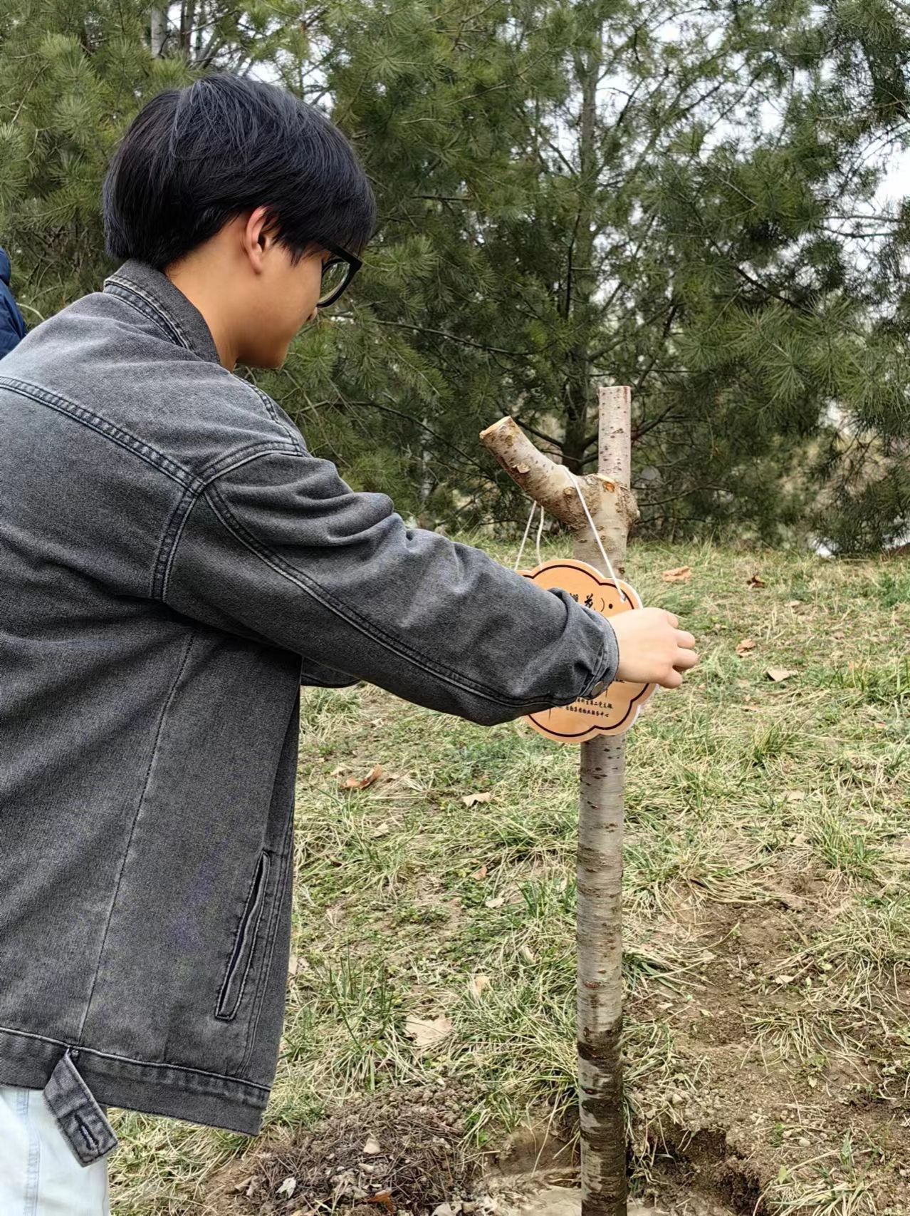 挖坑、摆苗、填土、浇水……随着最后一抔土壤的落定,最后一桶清泉的润泽,科普小名牌挂上枝头,大功告成,拍照打卡!擦干额头的汗水,拂去裤脚的轻尘,看着眼前的一株株樱花苗入住“海天雅居”,同学们的脸上无不洋溢着灿烂的笑容。欢声笑语间,本次植树活动圆满结束。