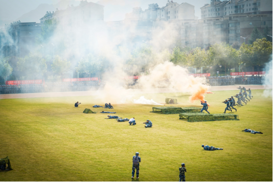 在紧张刺激的突击表演和医疗救护中,新生们听从教官的指挥,以标准的动作穿越搭建的前线战场。在炮弹声与烟雾中,新生们身手敏捷,完美完成了战地救护,突击冲锋,运送伤员的任务。