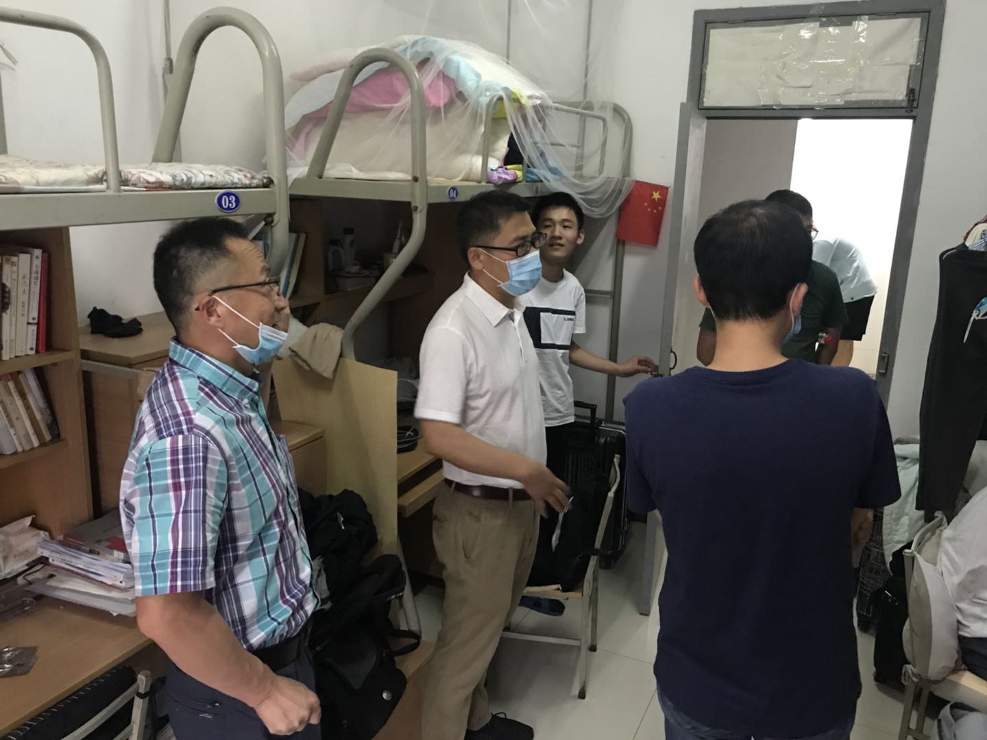 党委书记孙华强、党委副书记王银涛、院长助理张龙、2018级辅导员叶鹏程、2019级辅导员王士刚共同走访第三批返校学生宿舍。