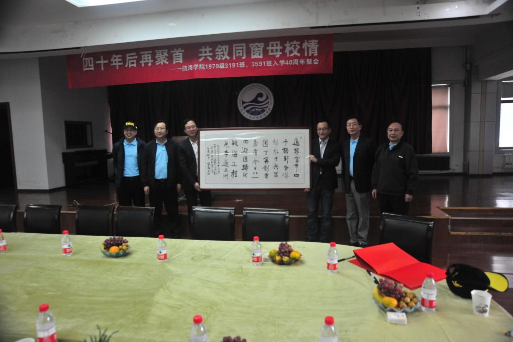 杰出校友代表段桂林、李明向学院赠送书法匾额,其上写着“遥想当年四十棵新苗唤超水中兵器,园丁再创业;还看今日八一四迎送铸就航海工程,桃李遍五洲”,以表示同学们对学院的关怀教育之恩的深深感谢。现场氛围一片高涨,校友们对学院和老师的栽培之恩的感激溢于言表。