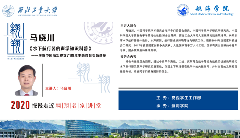 受疫情影响,此次报告在线上举行。除西工大师生外,此次报告还吸引了来自海军潜艇学院、中科院力学所、国家深海基地等单位的同行参与。报告主要进行了历史回顾,通过中日甲午海战、二战、英阿马岛战争等经典战役的讲解,说明现代水下航行器及其声学研究的重要性,体现水下航行器在战争中的关键作用,并对当前的发展趋势进行了分析,帮助同学们树立投身国防的信念。