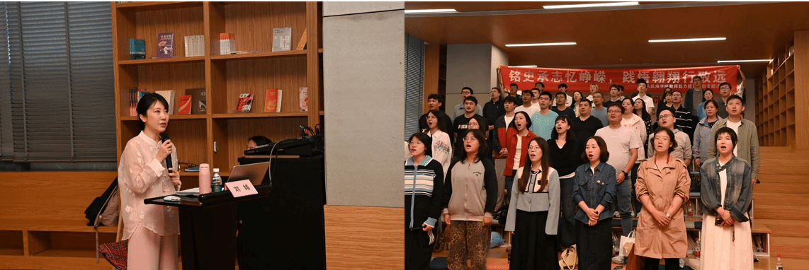 活动邀请西影厂资深艺术家刘婧老师,从“革命歌曲、光影岁月和不可忘却的抗战精神”出发,为全体师生讲授了一堂《延安革命之声》抗战音乐党课。本次党课不仅是一次历史知识的重温与回顾,更是一场强化青年教师自身队伍建设、淬炼育人初心使命的深刻实践。