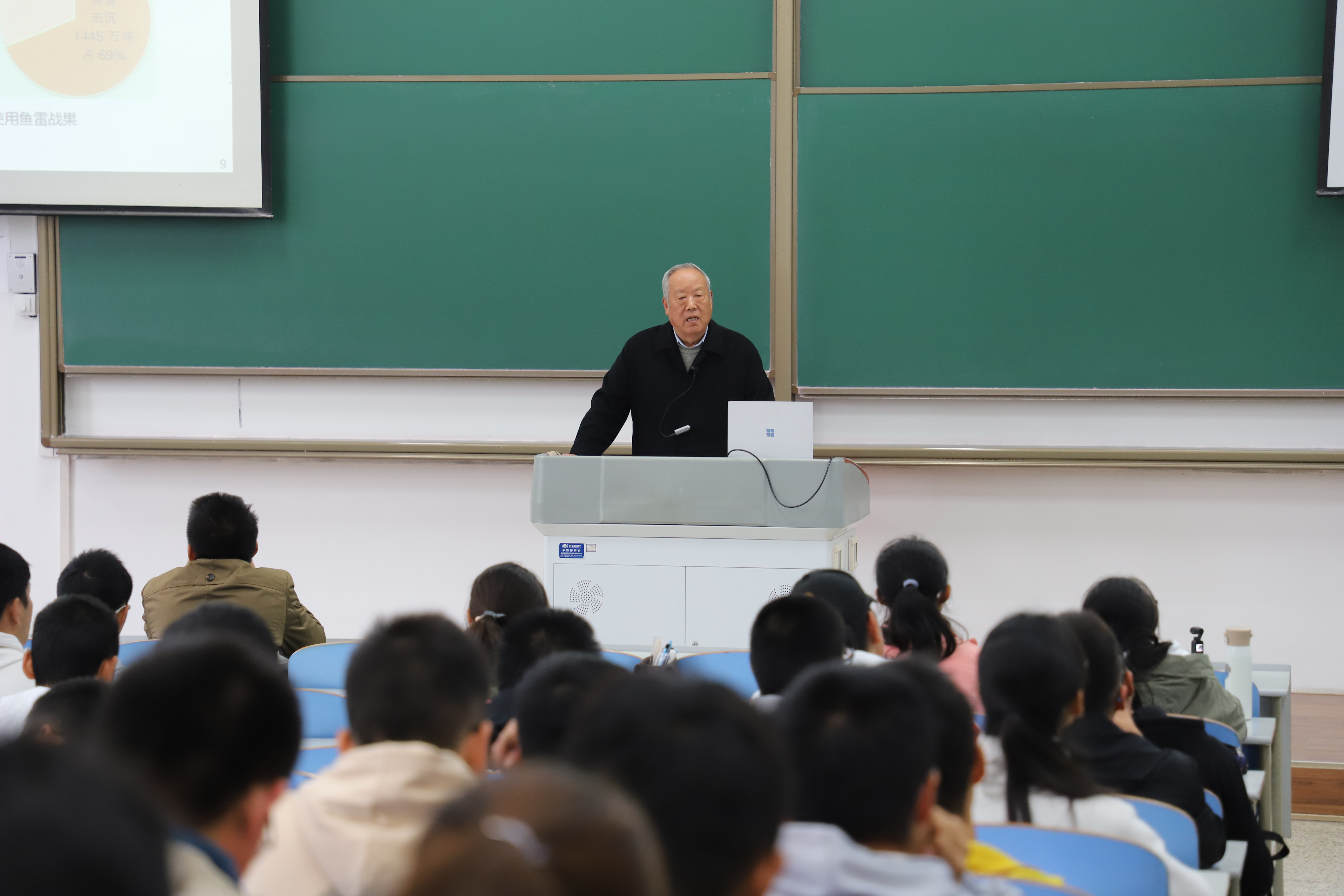 在讲到水中兵器概述时,徐德民院士向新生们介绍到“水中兵器是海上作战的主要力量,在曾经的数次大型战役中发挥着其巨大作用,是现代战争中不可或缺的重要武器装备,也是我军构建深远海攻防体系的重要组成部分”。