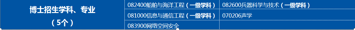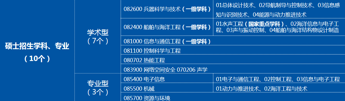 硕士招生学科专业10个(7学术型、3个专业型)、博士招生学科专业6个,设兵器科学与技术、船舶与海洋工程、信息与通信工程3个一级学科博士学位授权点和声学、网络空间安全2个二级学科博士学位授权点,其中武器系统与运用工程和水声工程是国家重点学科。