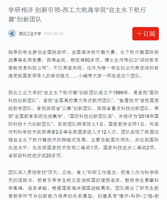 “自主水下航行器”创新团队成立于1999年,长期从事新型水中兵器、水下航行器基础理论和核心技术攻关、工程型号研制以及人才培养工作。该团队是首批“国防科技创新团队”、首批“全国高校黄大年式教师团队”、“鱼雷技术”首批国家级教学团队、首批陕西省“三秦”创新团队、陕西省重点科技创新团队,荣获“全国教育系统先进集体”、“国防科技创新团队奖”、并被评为“2018年国防科技十大创新团队”。